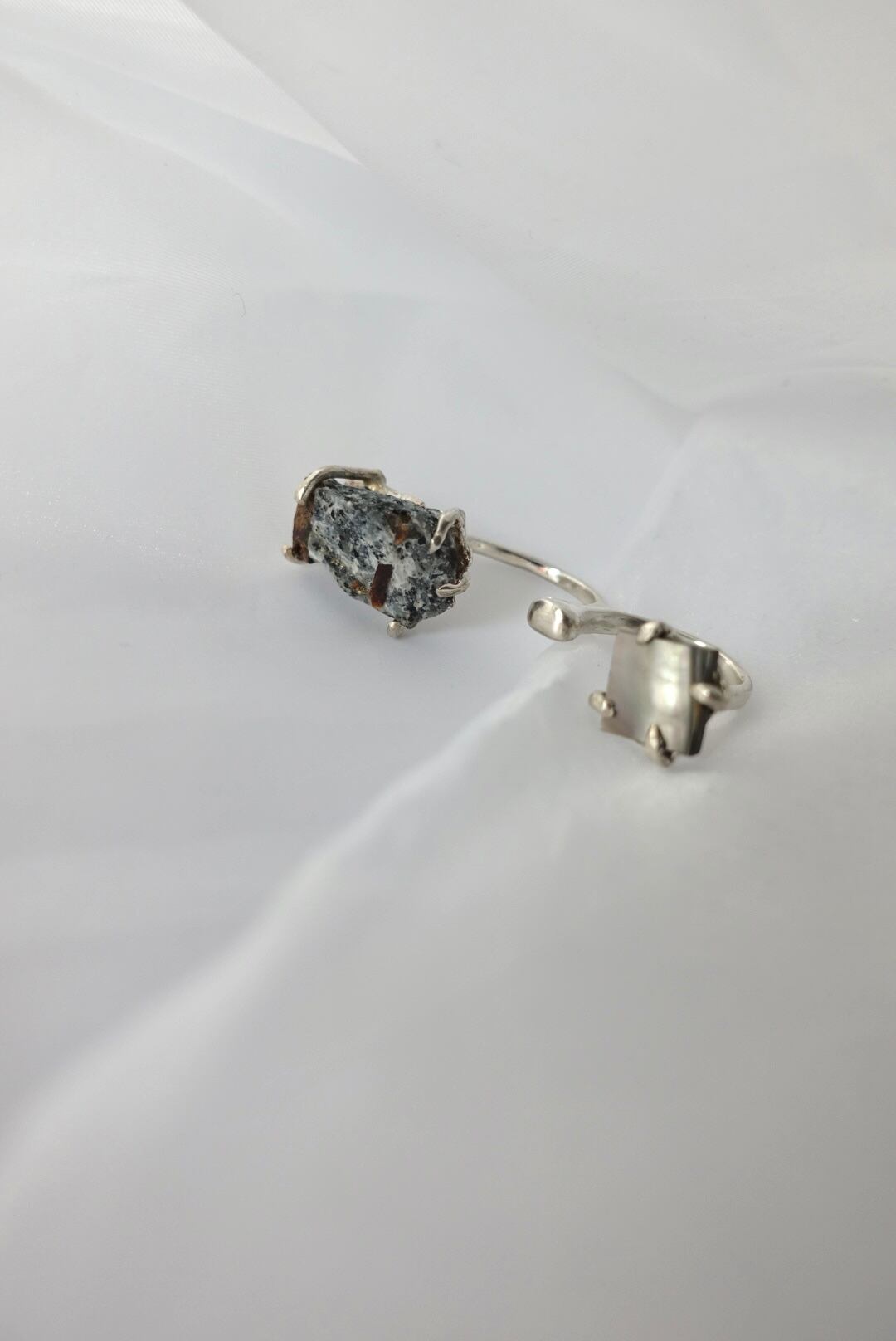 アストロフィライトとスクエアシェルのダブルリングを、柔らかな花弁が抱く